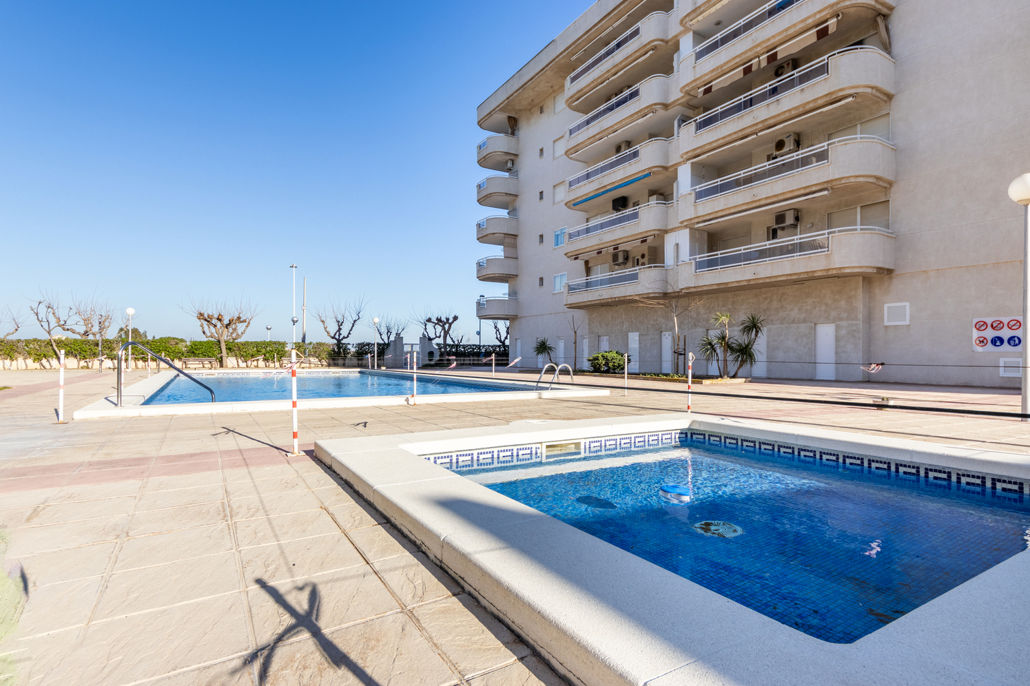 Long-term rental apartment in La Pineda Platja, in the Porta del Mar area, Prat de Ponç Street. Bright apartment located on the fifth floor with elevator, in a 1998 building with landscaped areas and communal swimming pool, just a few minutes from the Mediterranean Sea and the seafront promenade.