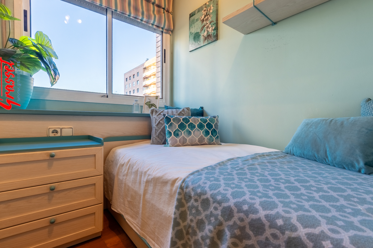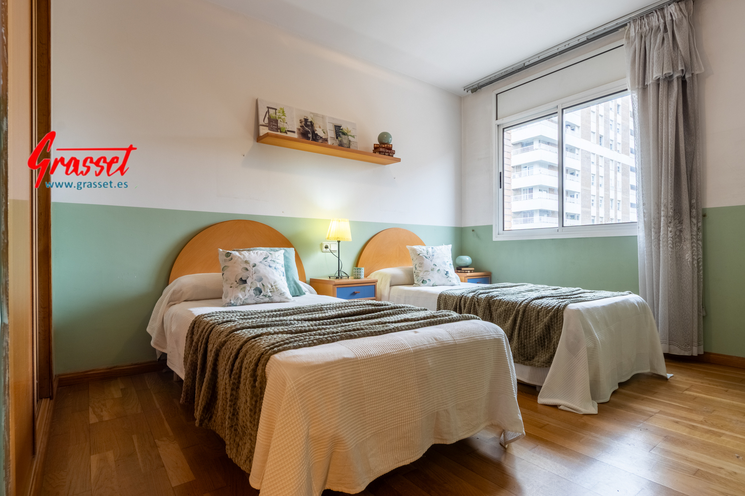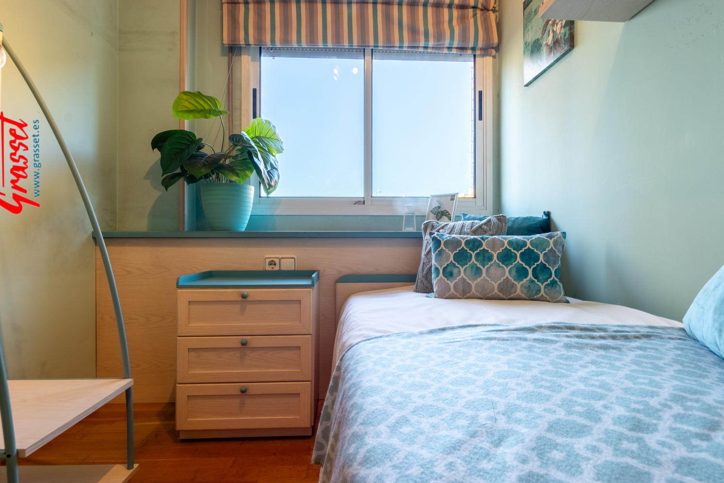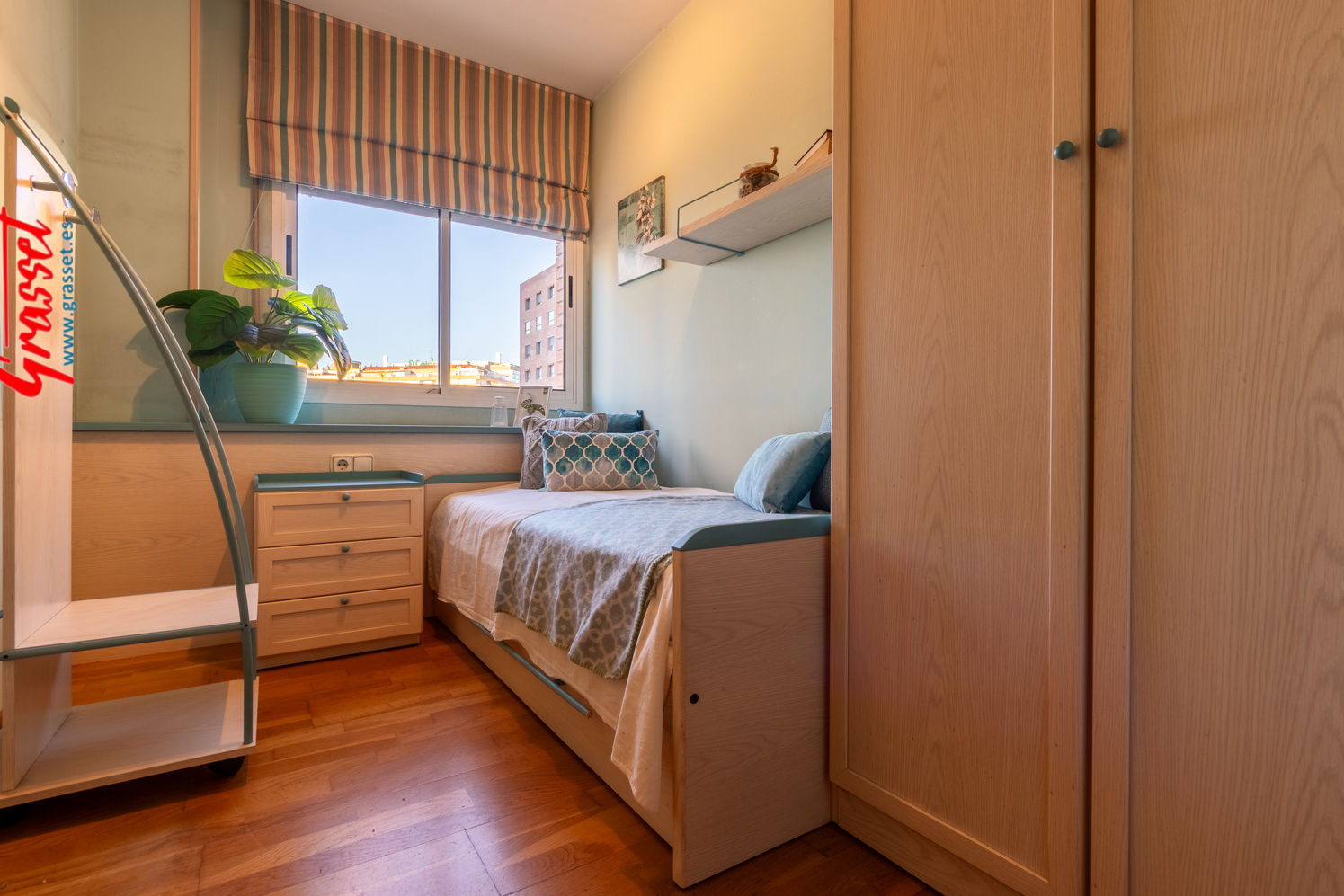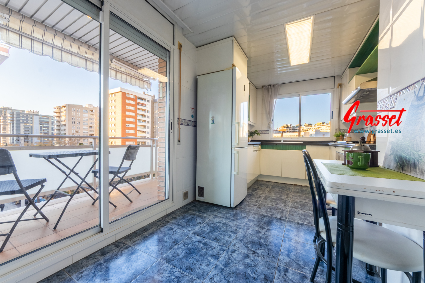 Hablamos de 114,38 m² útiles reales (135 m² construidos), muy bien distribuidos: 4 dormitorios (2 dobles y 2 individuales) con armarios empotrados, 2 baños —uno en suite—, cocina office independiente, donde desayunará toda la familia por las mañanas con vistas al parque de la Quinta de Sant Rafael.